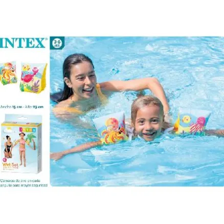 Manguitos hinchables 23x15cm Peces de Intex. Los manguitos llevan incorporadas 2 cámaras de aire y panel plano interior para mayor comodidad. De color naranja y blanco con diferentes ilustraciones de animales marinos.