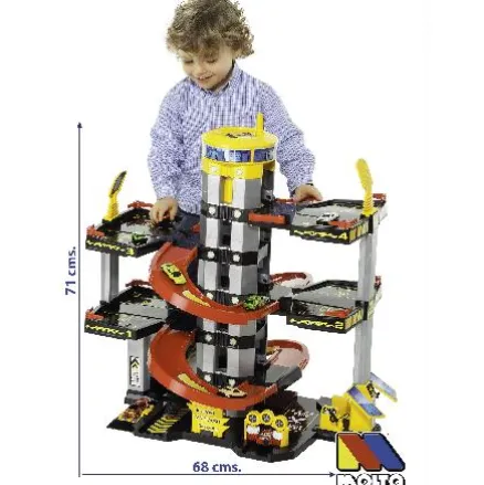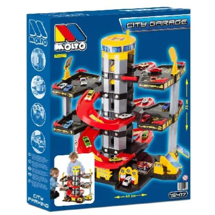 Parking 5 plantas de Moltó. Estupendo garaje, fuerte, resistente, fácil de montar y de mucha estabilidad. Contiene ascensor, lavado de coches, engrase, estación de servicios y muchos accesorios. Funciona sin pilas. Coches no incluídos. Medidas 73x65x51cm.