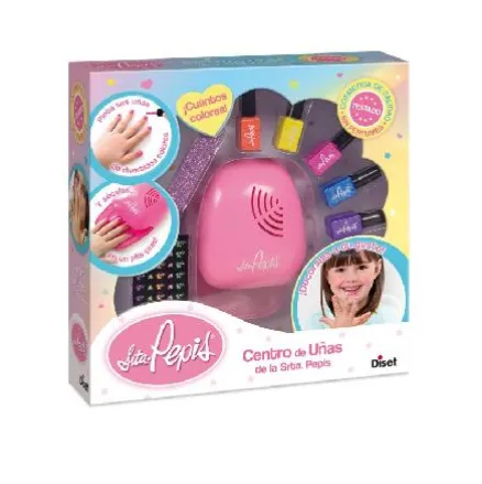 Centro de Uñas de la Srta. Pepis de Diset. Con el centro de uñas de la Srta. Pepis lo pasarás en grande pintando, decorando y secando tus uñas con los secretos de la Srta. Pepis. En cuatro sencillos pasos, podrás aprender a pintarte las uñas tendrás tu manicura perfecta como la de tu mamá. Lucir una manicura perfecta es un imprescindible para poder sacar el máximo partido a tus uñas así que sigue las instrucciones de este kit de manicura para niñas y empieza limándote las uñas con la lima de uñas con purpurina para conseguir un contorno uniforme, después elige el color con el que te las vas a pintar.